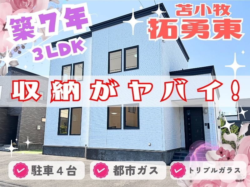 【月々93,983円のお支払い】※お借入の参考例:お借入総額3,500万円の場合(当初固定金利3年・金利0.7%・お借り入れ期間35年・ボーナス払いなし)※その他諸費用発生致します。🔶まだまだピカピカの断熱性能がかなり高い(トリプルガラス)のお家です!人気の拓勇東町エリア✨都市ガスで経済的😊お車4台駐車でき、お庭スペースは管理のしやすい広さ!物置有!シンプルな外観・収納豊富な無駄のない間取り・全居室7帖以上・リビング南向き・対面式のシステムキッチン・エコジョーズ・浴室は広々1坪以上でゆったりくつろげ疲れを癒すことができます😊ママに嬉しい、メリット沢山のよくばり住宅のご紹介です!!!🔶公園横の住宅街🎵🔶学校区の拓勇小学校まで徒歩7分で安心🎵🔶スーパー・ドラッグストア・イオンetc...お車でスグです😊🔶利便性高く、生活しやすい人気エリアで、春から新生活を迎えませんか。🔶ご内覧のご予約必須です。お電話・公式LINEからの受付も可能!🔶詳細はエイシン不動産までお気軽にお問い合わせください😊