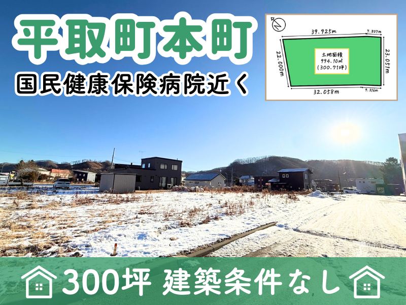 🔶平取町本町・国民健康保険病院近くの宅地300坪です🍀 🔶建築条件がないため、ご希望の工務店・ハウスメーカー様で建築可能🏠 🔶苫小牧信用金庫・ローソン・Aコープ・図書館・郵便局・役場がすべて徒歩15分圏内と周辺施設も充実しています✨ 🔶詳細はエイシン不動産までお気軽にお問い合わせください😊