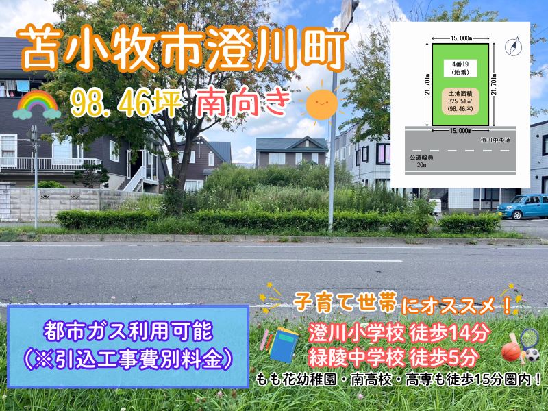 🔶澄川中央通に面した、南向き約98坪の宅地です🌞 🔶建築条件がないため、ご希望の工務店・ハウスメーカー様で建築できます🏠 🔶都市ガスの引込工事(※別料金)を実施された場合、都市ガスもご利用可能です✨ 🔶バス停まで徒歩1分🚌苫小牧西ICへのアクセスも良く、通勤・通学・お出かけも便利🎵 🔶周辺環境も充実しており、コンビニ・スーパー・ドラッグストアが徒歩10分以内に揃っております👍 🔶澄川小学校まで徒歩14分、緑陵中学校まで徒歩5分🏫もも花幼稚園・南高校・高専も徒歩15分圏内で、お子様のいるご家庭にもオススメの立地です🌈 🔶詳細はエイシン不動産までお気軽にお問い合わせください😊