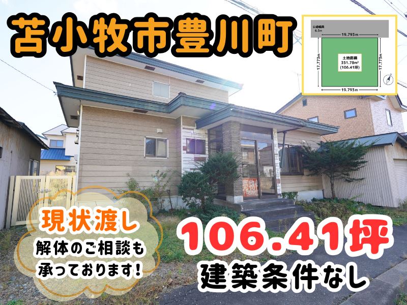 🔶苫小牧市豊川町の宅地106.41坪です🎵 🔶建築条件がないため、ご希望ハウスメーカー・工務店様で建築可能🏠 🔶現状渡しとなるため、建物解体のご相談も承っております🌼 🔶豊川小学校まで徒歩5分とお子様の通学も安心の立地✨ 🔶ツルハドラッグ・とましん・郵便局・セイコーマート・桜木ファミリークリニックも徒歩15分圏内に揃っており、周辺施設も充実しています🌈 🔶詳細はエイシン不動産までお気軽にお問い合わせください😊