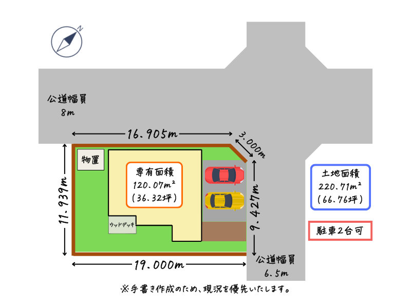 北西側 幅8mの公道に16.905m接道