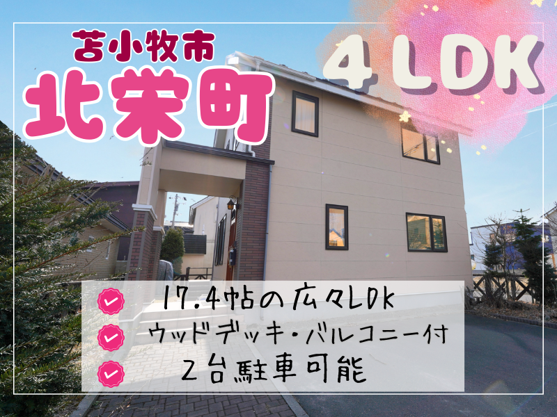🔴弊社売主のため、仲介手数料不要【月々66,862円のお支払い】※お借入の参考例:お借入総額2,490万円の場合 (当初固定金利3年・金利0.7%・お借り入れ期間35年・ボーナス払いなし) ※その他諸費用発生致します。🔶苫小牧市北栄町・バルコニー&ウッドデッキ付きの4LDK戸建です🏠 🔶目の前には沼ノ端北10号公園があり、白鳥公園も徒歩4分🛝徒歩10分圏内には保育施設も複数あり、小さなお子様のいるご家庭に嬉しい住環境🌼 コンビニ・郵便局・金融機関・スーパー・ホームセンター・ドラッグストア等も徒歩15分圏内に揃っており、利便性良好です👍 🔶駐車スぺースはアスファルト舗装済で2台駐車可能🚘 🔶約17.4帖のLDKは二面採光で明るく開放的🌞 🔶全居室・洗面所・リビング・キッチンに収納が付いているため、居住空間を有効活用できます🙌 🔶ご内覧のご希望・詳細・ご質問はエイシン不動産までお問い合わせお待ちしております😊