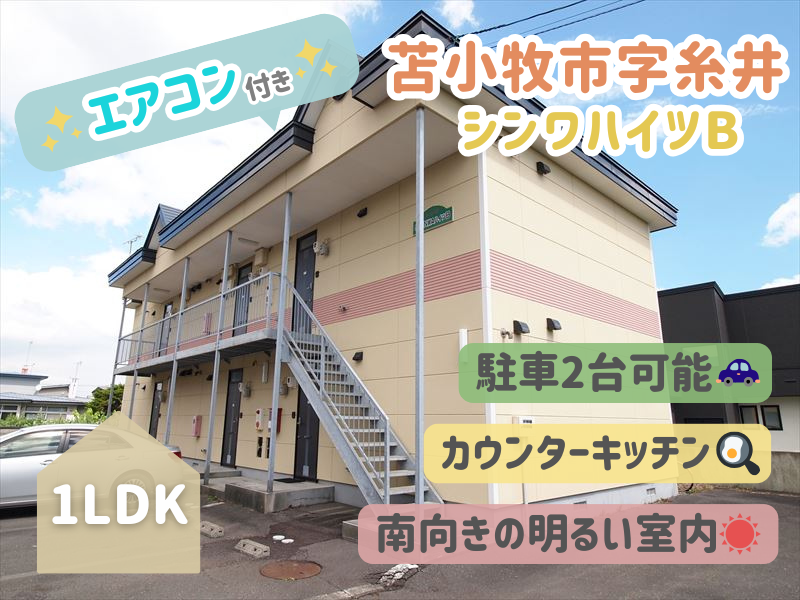 【エアコン付きで夏も快適🍉】JR糸井駅徒歩10分🚃閑静な住宅街・苫小牧市字糸井の1階角部屋1LDK🏡 敷金・礼金・仲介手数料無料✨ 敷地内駐車2台可能(1台目:無料、2台目:3,000円)🚙二人暮らしを始めたい方にもオススメの物件です⭐ 南向きで日当たり良好☀ 玄関にシューズボックスと収納スペースあり🎵 キッチンは人気の対面式🍳洗い物がしやすい広めのシンクです🫧 そのほかに照明器具・灯油FFストーブ・シャンプードレッサーも揃っております👍 郵便局徒歩8分、セブンイレブン徒歩9分🏪ホクレンショップ・ヤマダ電機・サツドラも徒歩15分圏内にあり、周辺施設も充実しています🌈 詳細はエイシン不動産までお気軽にお問い合わせください😊